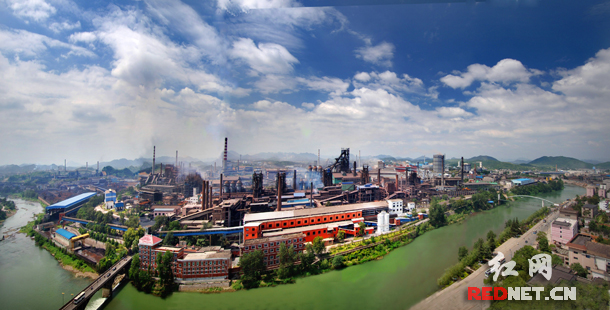 站在涟钢双菱大厦楼顶看涟钢,别有一番风景。近处,林立的高炉炉顶吐出的一团团白色水蒸气在蓝色的天空下慢慢飘散,成为一团飞舞的云彩;高炉下面,作为湘江支流的涟水河碧波荡漾,河岸绿树成荫,涟钢大桥车水马龙,一派繁忙;远处,铁红色的现代化工厂厂房鳞次栉比,一抹抹绿色与各种管道、皮带通廊等大型设备和谐交织。