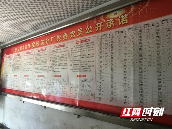 在衡钢各个分厂,“党支部承诺”都醒目地挂在墙上,每个党支部的公开承诺、党员签名,各党支部每个月的目标值、完成值、完成效果等一目了然。